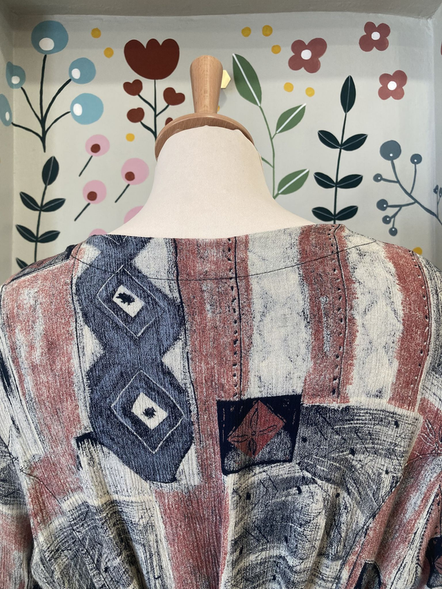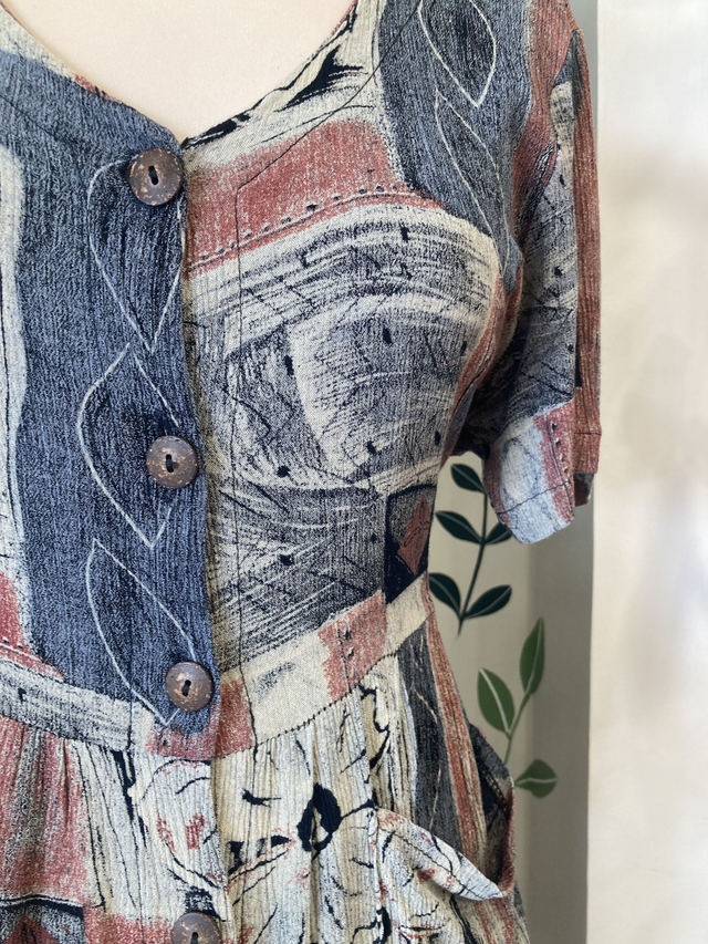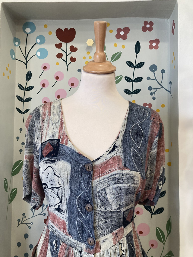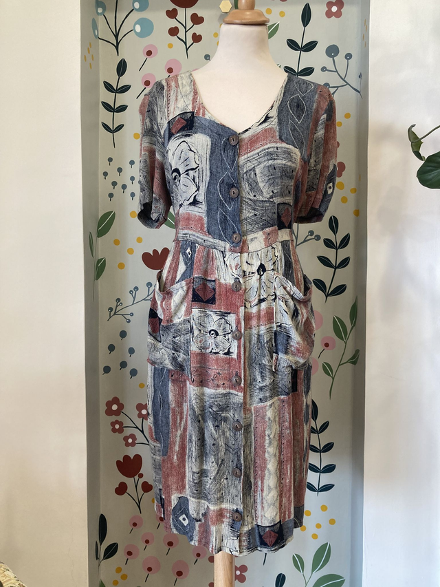 Abito Chemisier anni ‘90 con fantasia multicolore e laccio da stringere in vita