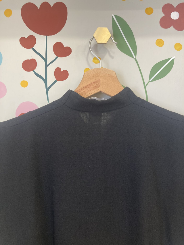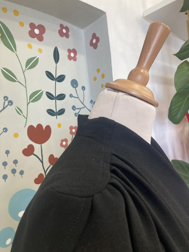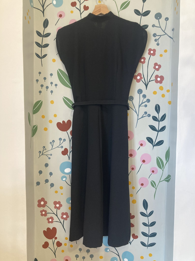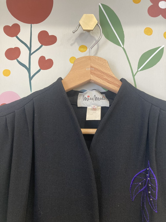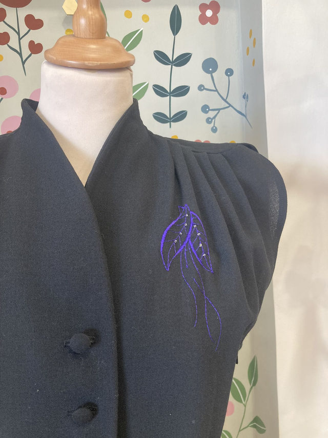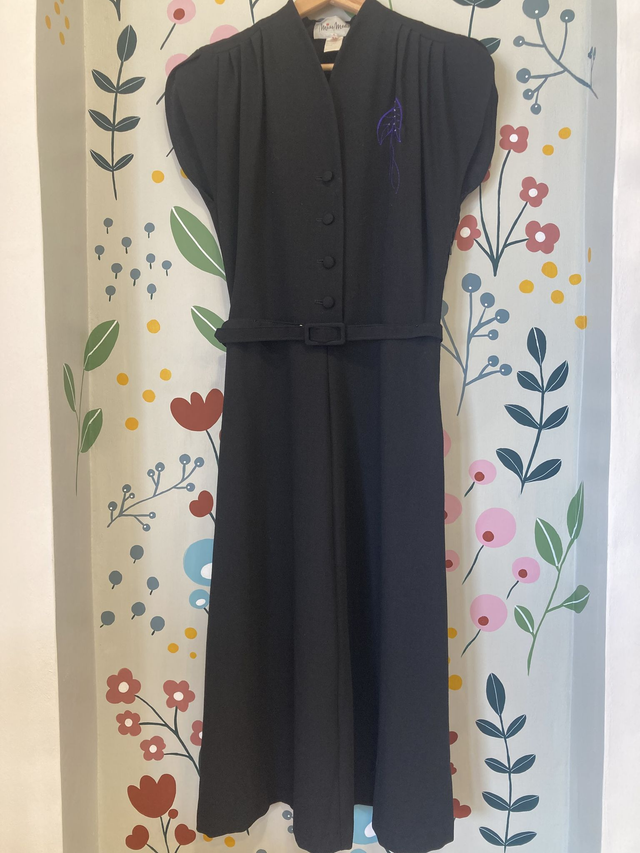 Abito nero con ricamo viola e arricciature sulle spalle e cintura in vita